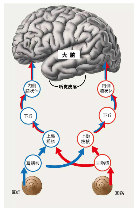 人類的大腦,偉大神秘,當(dāng)外界有聲音來臨時(shí),大腦里會發(fā)生一種獨(dú)特的雙耳處理,根據(jù)所獲得信息,如時(shí)間、強(qiáng)度、相位、頻率等等,利用接受聲音信號有利位置更好的耳朵或從雙耳信號差異中提取有效聲音信息,消除噪聲,從而進(jìn)行一個(gè)同側(cè)或?qū)?cè)信號處理,獲得清晰立體聆聽。因此,雙耳聆聽有助于增加兩側(cè)大腦聽覺通路的活躍性,而單側(cè)聆聽因?yàn)橹淮碳蝹?cè)就容易導(dǎo)致醫(yī)學(xué)上的“聽覺剝奪”現(xiàn)象。見圖一